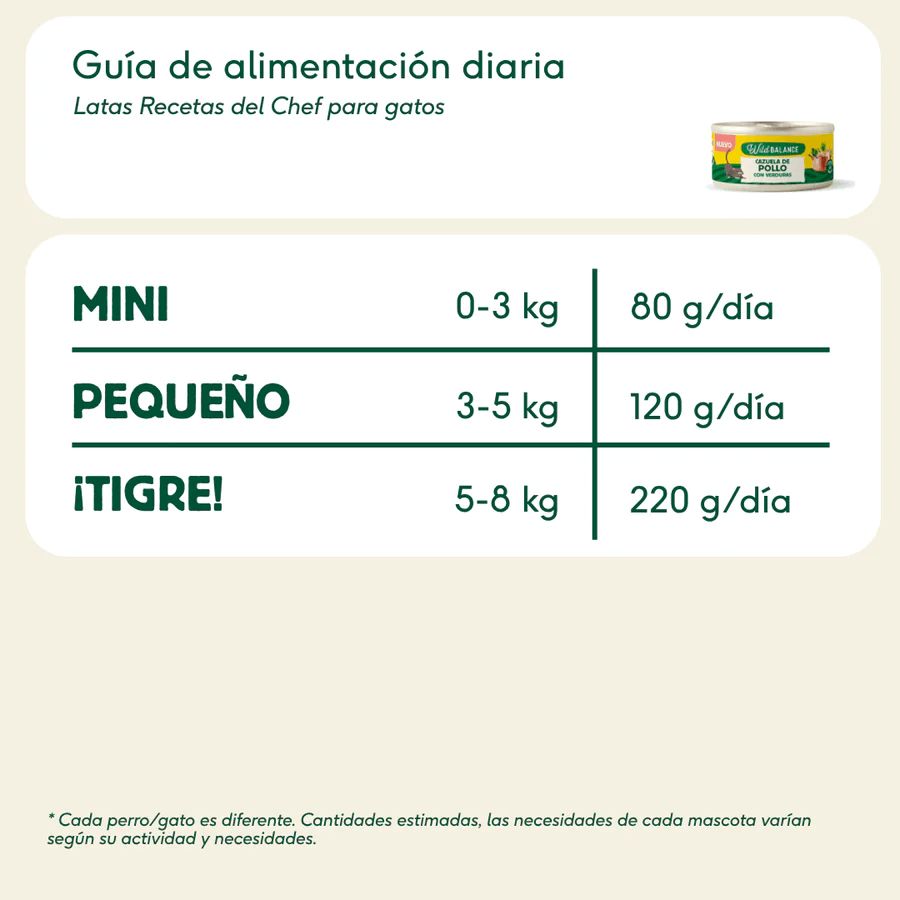 En Wild Balance somos conscientes de la importancia que tiene la alimentación para nuestros gatos, por ello todas nuestras latas contienen ingredientes de calidad, con un alto porcentaje de carne y verduras (95% pollo, 4% zanahoria y 1% guisantes). Cocinados a fuego lento y con mucho amor. ¡Las latas de recetas del chef para gatos están para chuparse las patitas!
